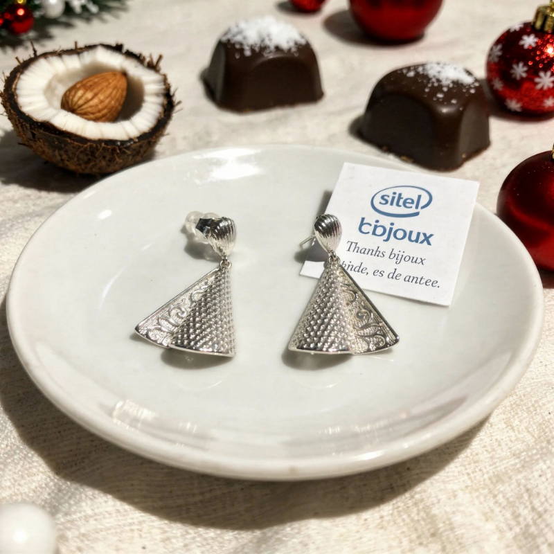 Découvrez ces superbes boucles d'oreilles au design moderne et sophistiqué. Leurs triangles texturés argentés captent la lumière à chaque mouvement, créant un effet visuel captivant et élégant.
